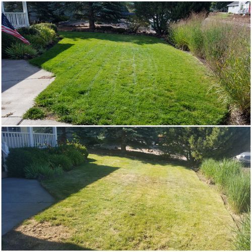 Building a microbial infrastructure can dramatically enhance your lawn and recover from stress and damage. In this lawn we built a soil structure to aid in recovering this lawn. Instead of removing the lawn and laying new sod down, we were able to rehabilitate the lawn. We aerated, dethatched, seeded and top dressed with compost to build a lush green lawn.